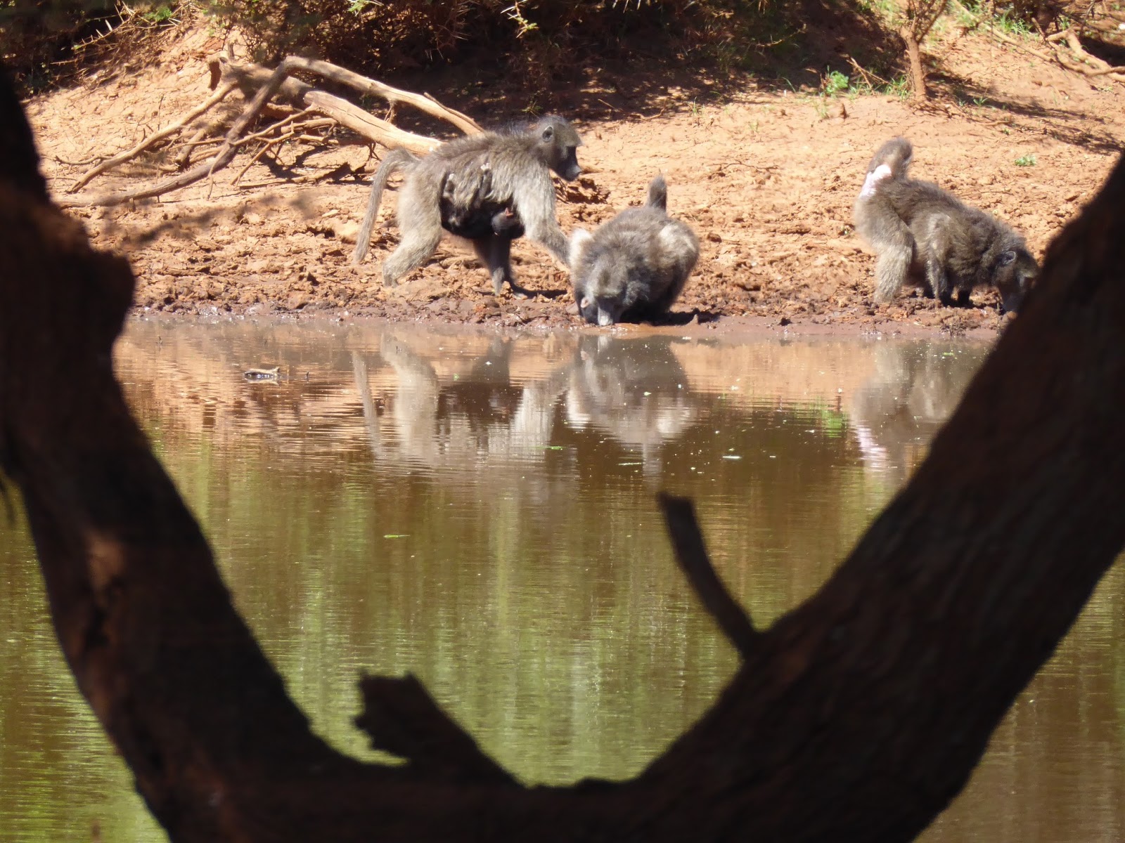 En après-midi, on prend ça molo comme les animaux des alentours. Il fait 34 degrés... Nous nous installons à l'ombre d'un acacia avec vue sur le petit lac et lisons ou somnolons, c'est selon. Une troupe de babouins vient s'abreuver à l'étang. Ils y passent bien une heure à boire, se prélasser à l'ombre et se chamailler. Toujours intéressant!